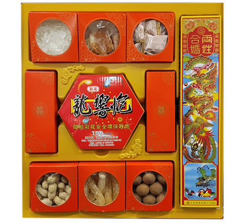冰糖、桔糖、巧克力、帶殼花生、冬瓜條、帶殼桂圓、禮炮、禮香、禮燭